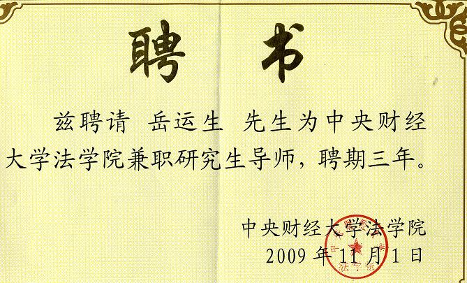 讲座结束后,中央财经大学法学院院长教学事务助理张小平博士受郭锋院长委托,宣读了法学院学术委员会关于聘请岳运生主任担任法学院兼职研究生导师的决定并颁发了聘书。
