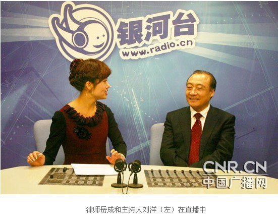 2009年1月21日15时,岳成律师作客中央人民广播电台银河台“仰韶就业”人物专访《先进工作者》栏目,接受主持人刘洋访问。下为文字实录: