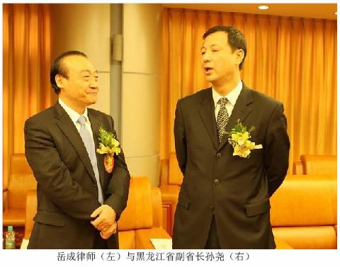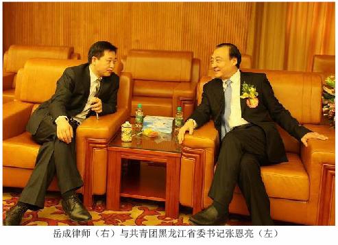 2010年3月10日,北京黑龙江企业商会一届三次会员大会暨“华勇杯”商会三周年庆典大会在京隆重举行,岳成律师出席了本次大会。鉴于岳成律师在北京黑龙江企业商会工作中所做贡献,京龙商会授予岳成律师“积极服务商会奖”、“两推双百先进个人”、“黑龙江旅游推介先进个人”表彰。