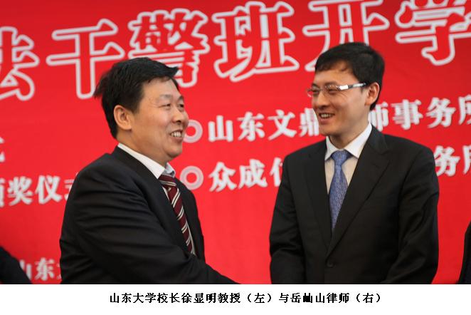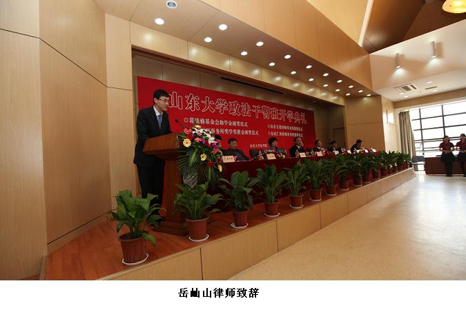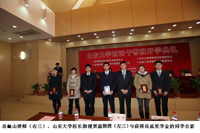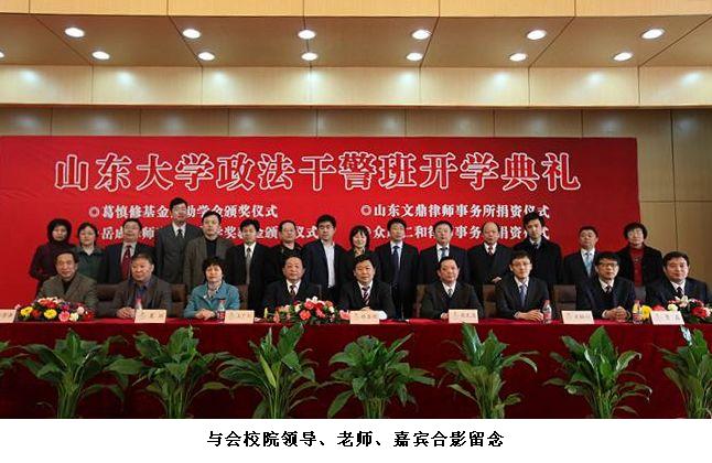 2010年3月28日,山东大学政法干警培训班开学典礼暨奖学奖教金颁奖仪式在山东大学法学院隆重举行。山东大学校长徐显明教授、山东司法厅政治部主任张民忠出席本次活动。我所岳屾山律师应邀出席并为山东大学法学院2009年度岳成律师事务所奖教金奖学金获得者颁发了荣誉证书和奖金。