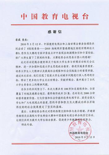 9月15日,中国教育电视台向岳成律师发来感谢信,感谢岳成律师作为专家评委对《创想青春——2010海峡两岸暨港澳地区高校世博辩论大赛》的热情支持和为大赛作出的精彩点评。