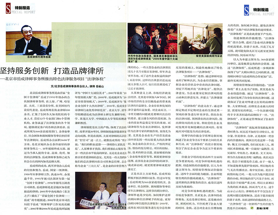 正是从以上方面考虑,岳成所始终积极开拓法律顾问业务。经过18年的发展,岳成所现为360家政府机关、企业事业单位、社会团体、新闻媒体等单位的常年法律顾问,这样多的顾问单位,在律师界也是少见的。如何维护这样多的顾问单位法律赋予的权益,更好地为顾问单位提供法律服务?2010年,岳成所在对以往服务进行充分总结和反思的基础上,创造性地推出了特色法律服务项目——“法律体检”。
