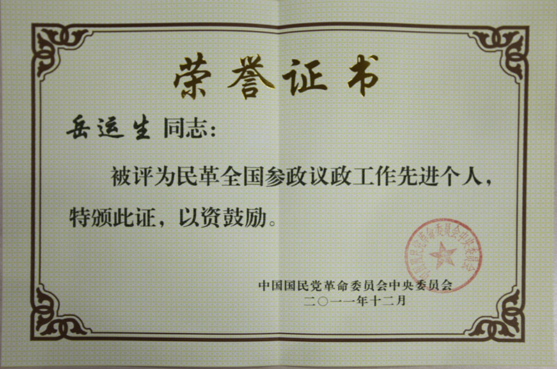 2011年12月,岳运生主任被评为“民革全国参政议政工作先进个人”。