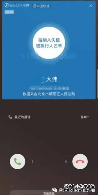 凡安装360手机卫士APP的用户,无论是拨打还是接到(划重点)被执行人的电话,手机屏幕上均会显示某某已被纳入失信被执行人名单的提示字样。被执行人履行债务后,法院将联系360公司取消标注。不信,你看: