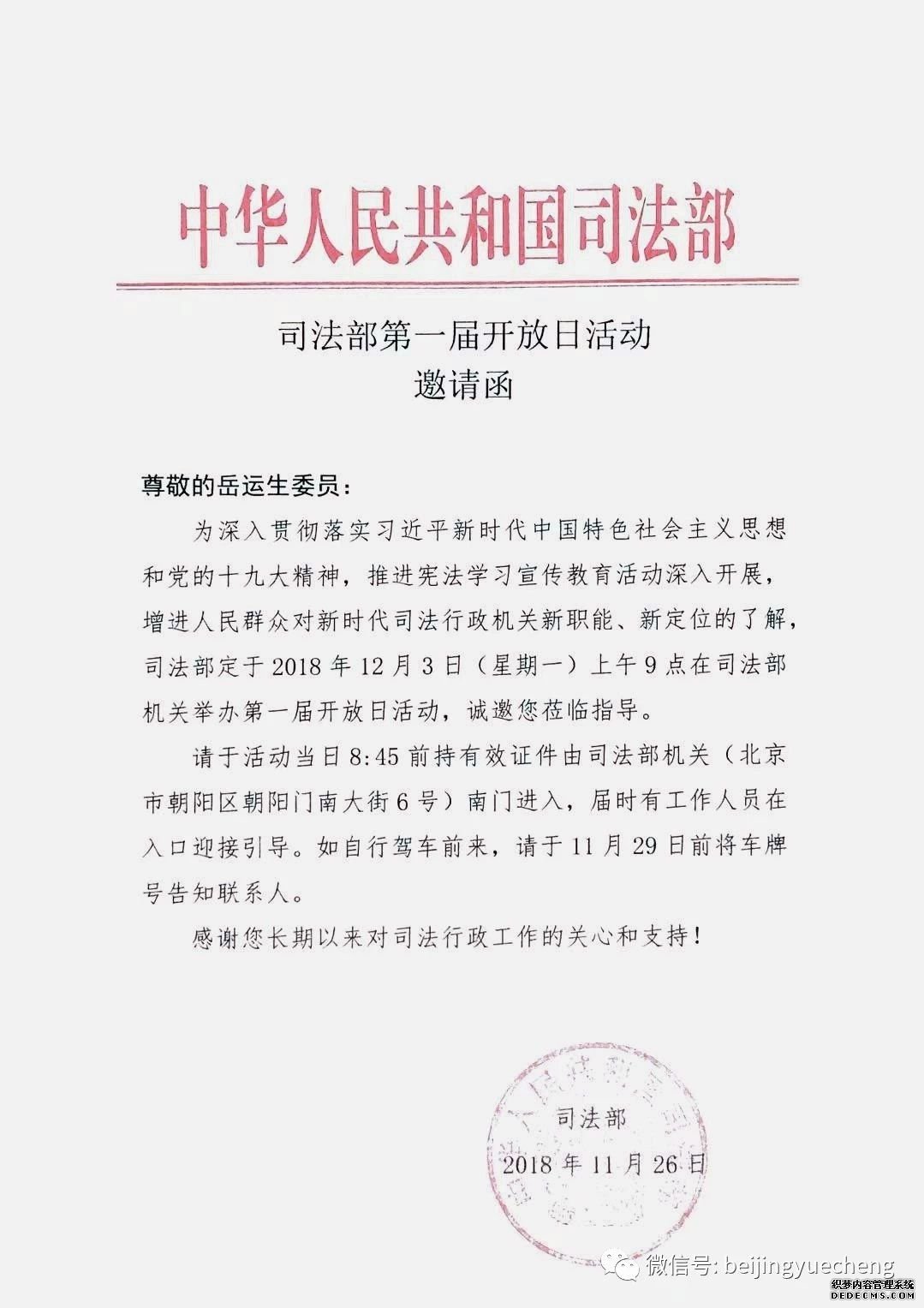 为深入贯彻落实习近平新时代中国特色社会主义思想和党的十九大精神,推进宪法学习宣传教育活动深入开展,增进人民群众对新时代司法行政机关新职能、新定位的了解,2018年12月3日,司法部举办第一届开放日活动。岳运生主任应邀参加了此次活动。
