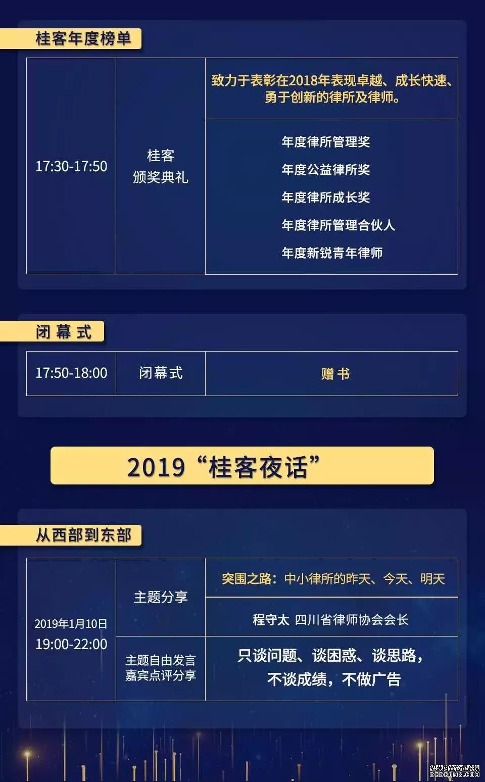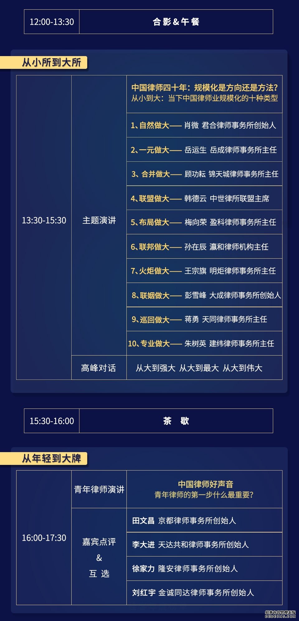 核心主题:律所组织与团队;律所战略管理;律所运营管理;律所模式创新;律所领导力;律所信息化;法律人工智能;青年律师成长;律所合并与资源整合;律所市场拓展与产品开发。