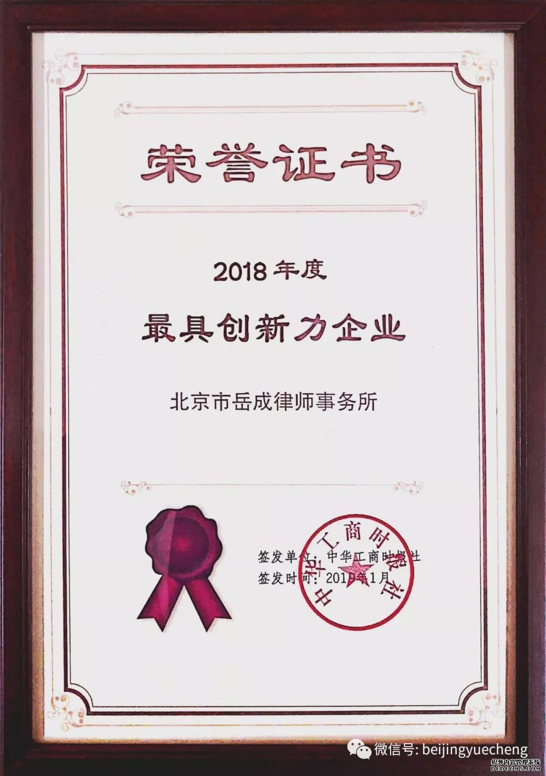 2019年1月18日,由全国工商联指导、中华工商时报主办的以信心中国:新起点新愿景新民企为主题的2018中国民营经济年会在北京举行。活动中揭晓了2018中国民营经济十大新闻事件和2018中国民营经济十大新闻人物、2018年度工商联(商会)工作创新中国最佳案例,评选出2018年度最具成长力企业、2018年度最具创新力企业、2018年度最具品牌影响力企业等奖项,北京岳成律师事务所被评选为2018年度最具创新力企业。
